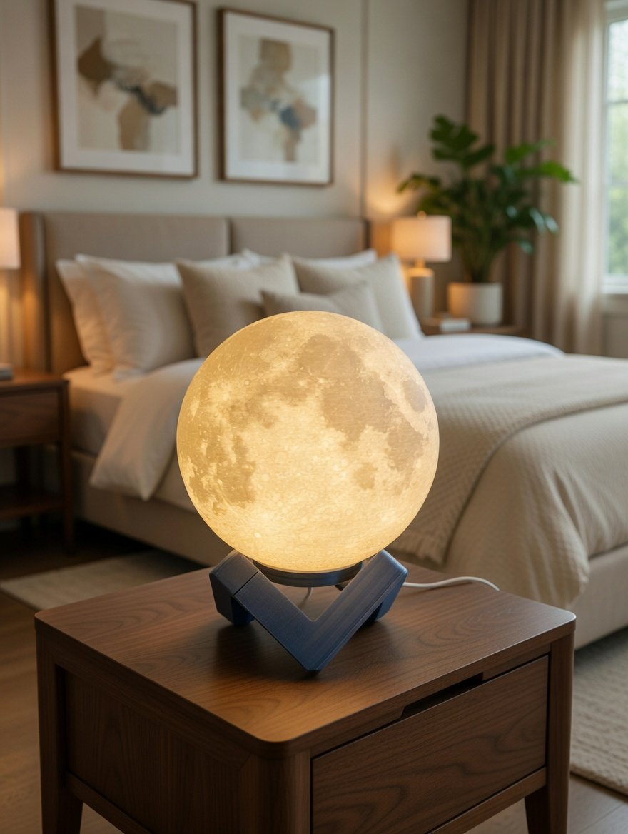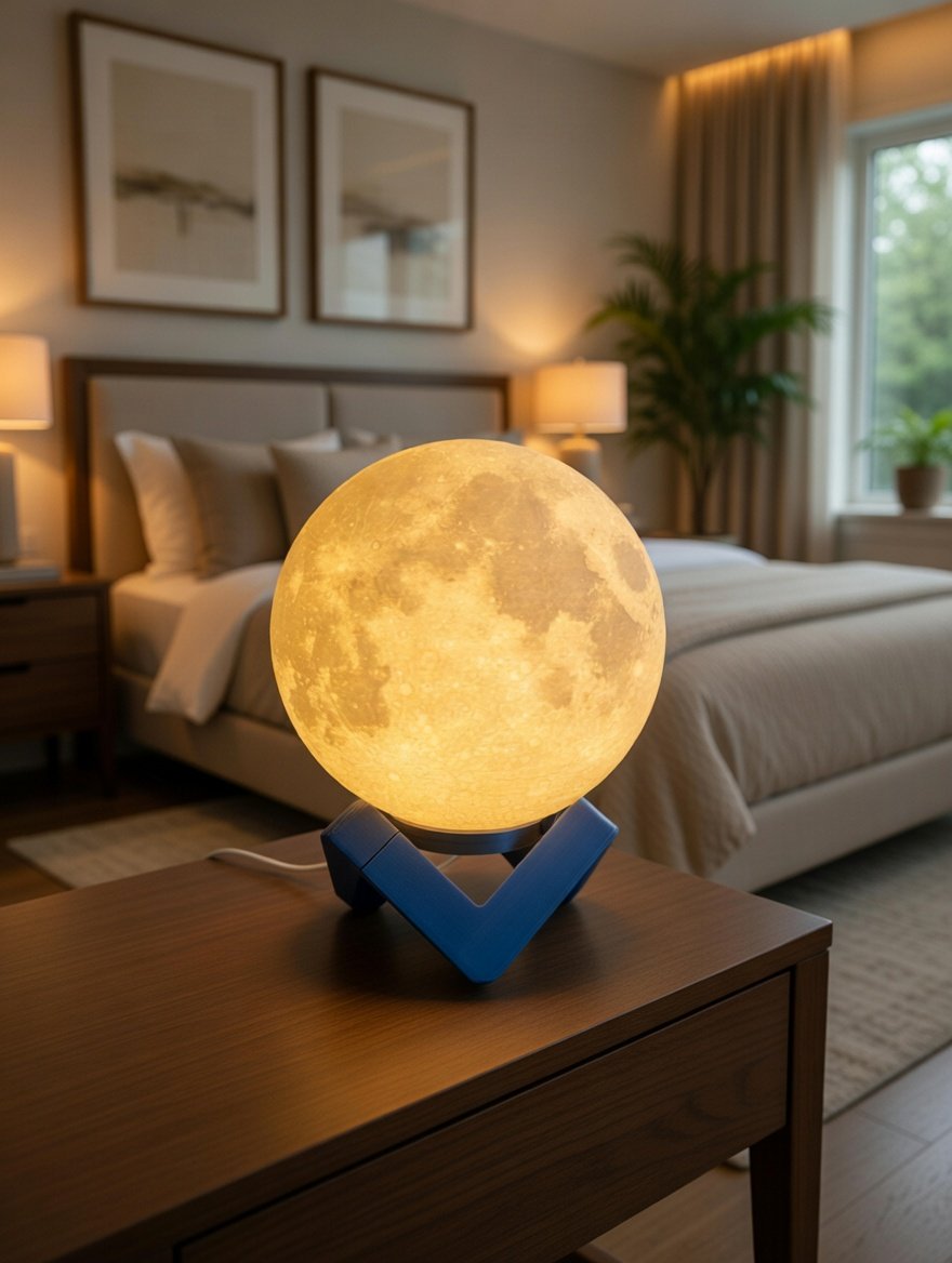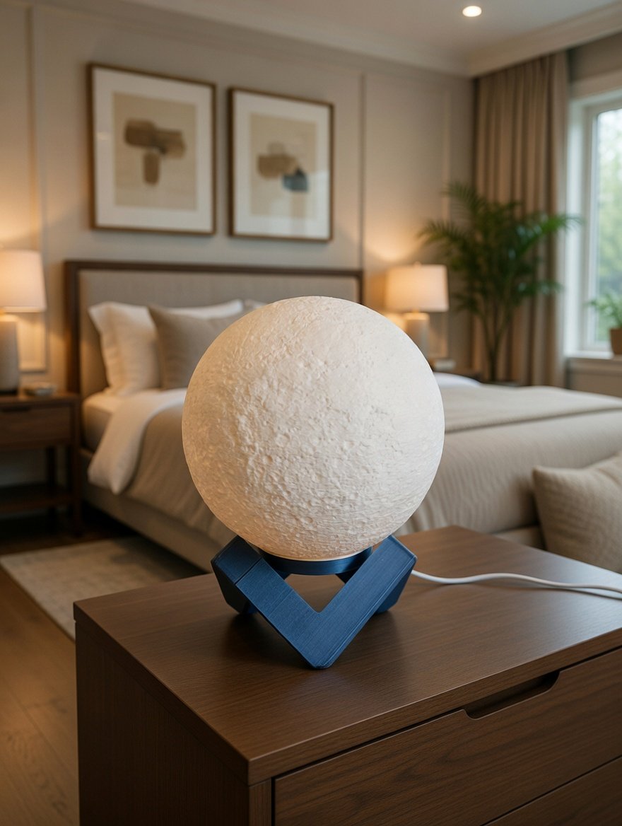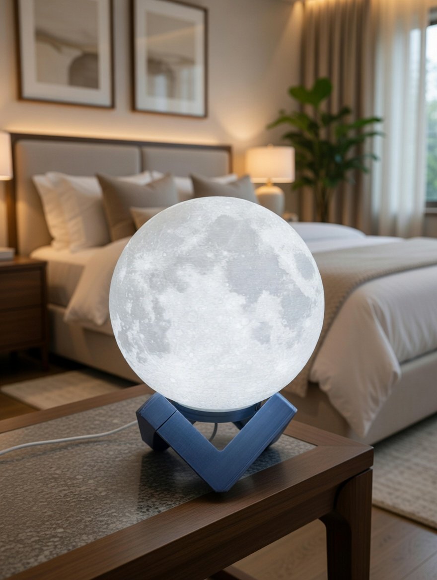 Lámpara decorativa creada mediante impresión 3D litófana, que revela los cráteres y relieves reales de la Luna al encenderse.